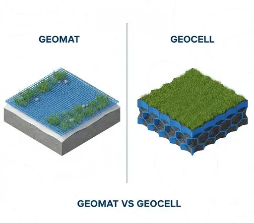Geomat dan Geocell adalah dua solusi geosintetik berbeda untuk stabilisasi tanah. Geomat (ECM) fokus pada perlindungan erosi permukaan dan